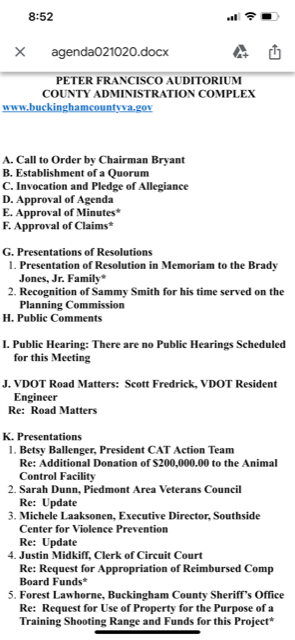 The meeting agenda and packet can be found here: http://buckinghamcountyva.org/Board%20Packets/2020/february%2010%202020%20bd%20pckt.pdf. Please let me know if you have any questions or concerns about any items, one of which includes the planning of a shooting range for the Sheriff’s Office on Andersonville Road on the site of the former Love Landfill. I want to hear your feedback!