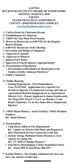 Here is a link to the full Board Agenda and Packet: http://buckinghamcountyva.org/Board%20Packets/2020/march%209%202020%20bos.pdf. As always, please let me know if you have any questions or concerns.