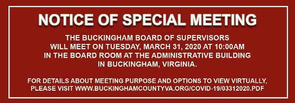 Our great and hardworking staff have assembled an excellent online great resource in how you can keep up with what and how your local government is continuing to serve you while keeping our county staff and residents safe. Also, there is a link here that will lead you to a YouTube channel where you can live stream our meetings: http://www.buckinghamcountyva.org/COVID19.HTML.