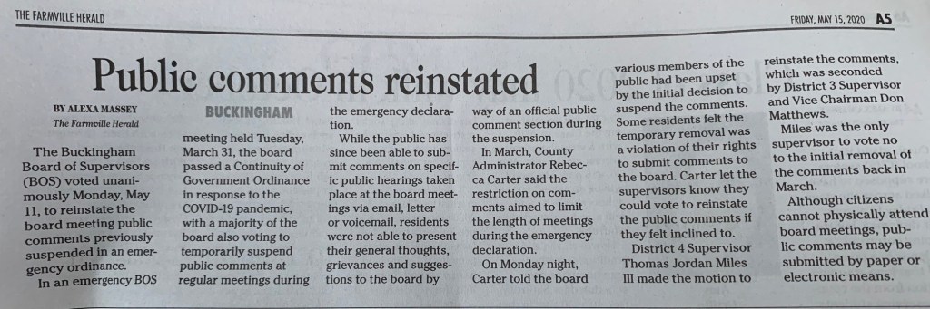 PLEASE always feel more than welcome to call, email, text or visit me (using social distancing for the time being). If you have any comments, ideas, criticisms, compliments, or anything to say regarding my representing you on the Buckingham Board of Supervisors, please get in touch with me. You can call/text me at 434-390-7023, email me at jmiles@buckinghamcounty.virginia.gov, or come see me at 13170 W. James Anderson Highway in the court house village. I would be pleased and happy to hear from you anytime.