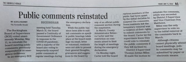 In response to the COVID-19 epidemic, Public Comments and Public Hearing Comments for Buckingham County Board of Supervisors meetings will be received using the following methods: