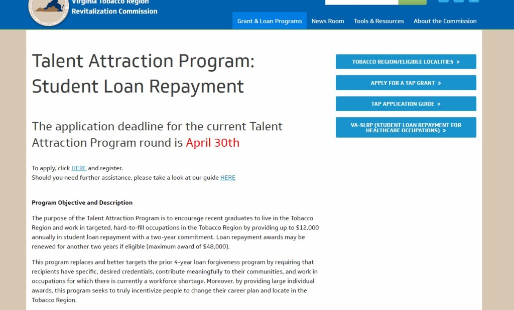 The Virginia Tobacco Commission’s Talent Attraction Program (student loan repayment) is now accepting applications through April 30th for eligible graduates. Please take a look at our TAP program page for more info.