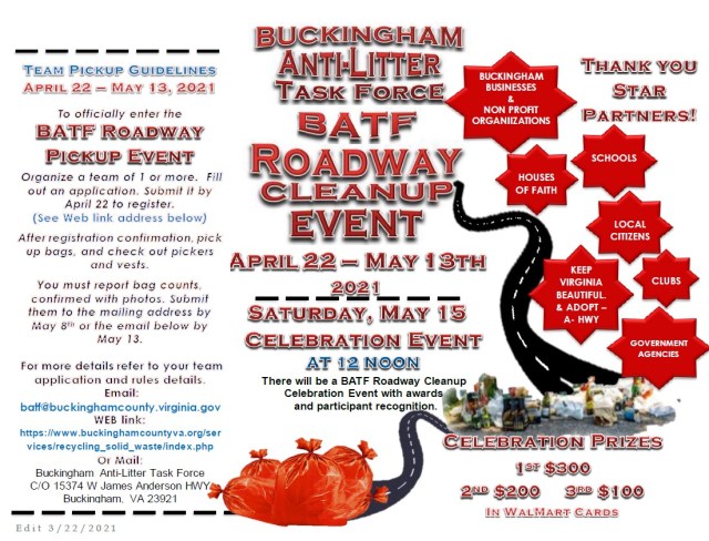 The Buckingham County Anti-Litter Task Force is working hard with volunteers to clean up Buckingham’s roads of litter and other debris. Many bags of trash have been collected, and we are appreciative of your hard work in doing your part in picking it up, not passing it up. Our celebration event will be held Saturday, May 15 from 10:30 a.m. -12:30 p.m. at the Community Pavilion behind the General Dollar in Dillwyn on Main Street to hand out prizes and commend those who have picked up litter in our county! Come join us!