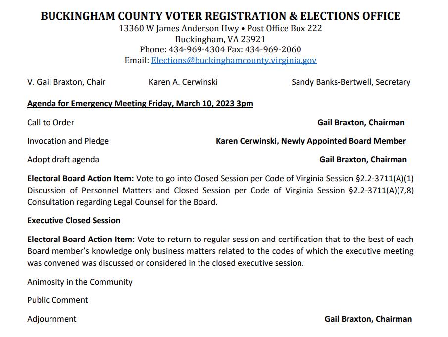 At any rate, yet again, in the normal “new” Buckingham Electoral Board style, a drastic change has been made to the agenda of the Friday 3 PM meeting of the Electoral Board. As of last night, their agenda had personnel and legal consultation being discussed in open session. Tonight, these topics are now listed are as being in closed session. It is common for bodies to find a late need to enter into closed session, but not remove open session items and placing them into closed session. Now the Electoral Board is set to hold two closed sessions: one before and one during the meeting, and having moved open session agenda items to closed session, which I found puzzling. What does the Electoral Board have to suddenly hide? I find this very disturbing seeing that this meeting has been thrown together in haste, and causing much confusion, under a cloud of perceived deceit and heightened awareness of their track record of bad governance (their public comment policy has been change three times since January, and quite honestly, I look for it to change again soon). Again, the meeting has been called for Friday, tomorrow, at 3 PM at the Agricultural Center on Route 60 in Buckingham at the call of the Board Secretary. Please attend if you care about free and fair elections and good governance from our Electoral Board. These sudden changes are bad governance.